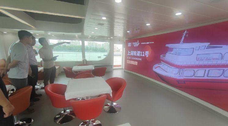 简单用餐过后,大家一同来到西渡船厂,参观近日完成试航任务的国内首艘新能源纯电动客渡船“上海轮渡11”,进入船舱,数字博物馆大屏映入眼帘,屏幕上展现的是上海轮渡的百年印记,随后在驾驶室我司详细讲解了自主研发的辅助驾驶系统并进行展示。